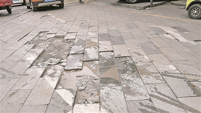 市西路一处路面出现地砖缺失、凹陷积水。